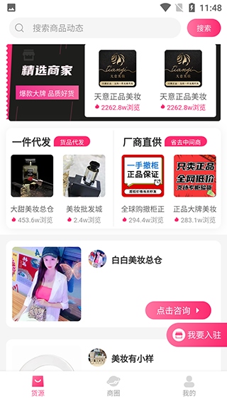 1. 打开软件后,您可以看到丰富的美妆货源,支持一件代发以及厂家直供。