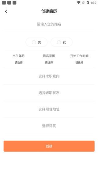 4、登录后首先创建简历,填写详细信息和求职意向,点击创建;