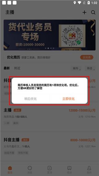 5、创建完成后,正式进入软件界面。如果简历有可优化的部分,系统会提醒你,点击稍后优化或立即优化;