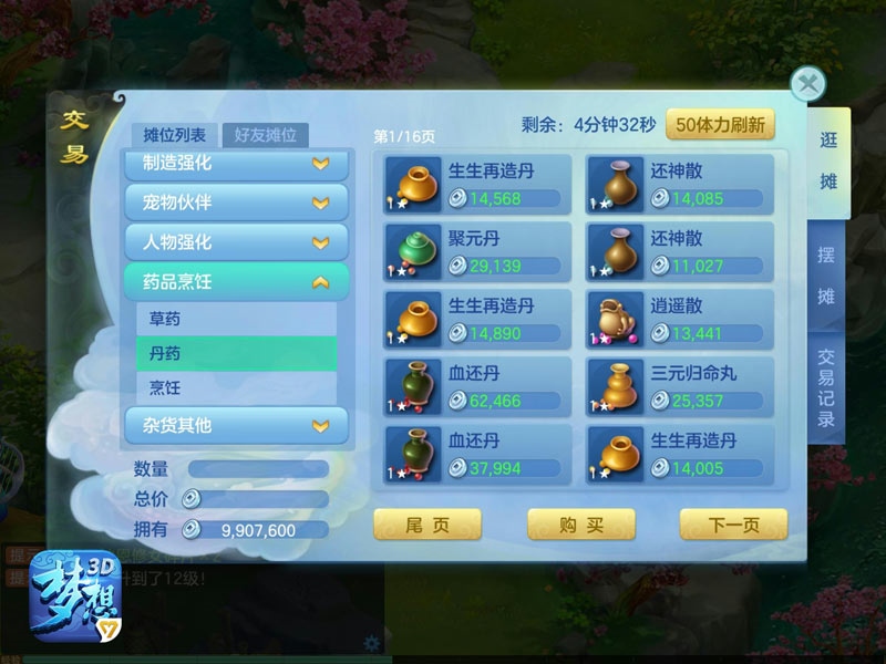右侧第二栏是“摆摊”,在游戏中获得的道具在绑定前都能摆摊出售,定价可在系统默认价格的合理范围内调整。如果每日提现低于一定银币数,系统将不收取税金。你可以在这个开放自由的市场中赚取第一桶金!