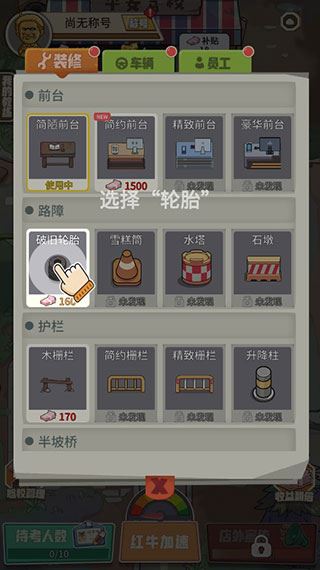 5、在“驾校管理”中,你可以选择装修、车辆和员工等选项。进入装修选项后,选择轮胎。
